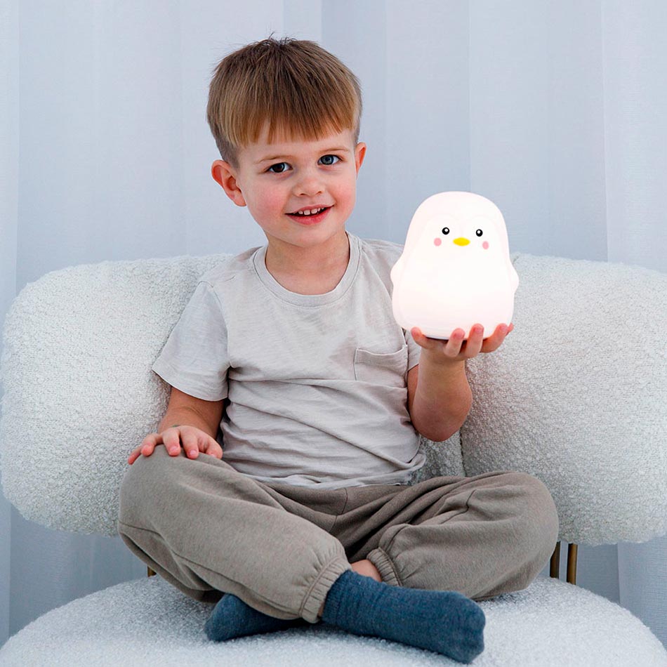 Este sueve pingüino de silicona se ilumina en 8 colores diferentes. Una luz quita miedos que brinda un ambiente tranquilo al momento de conciliar el sueño.