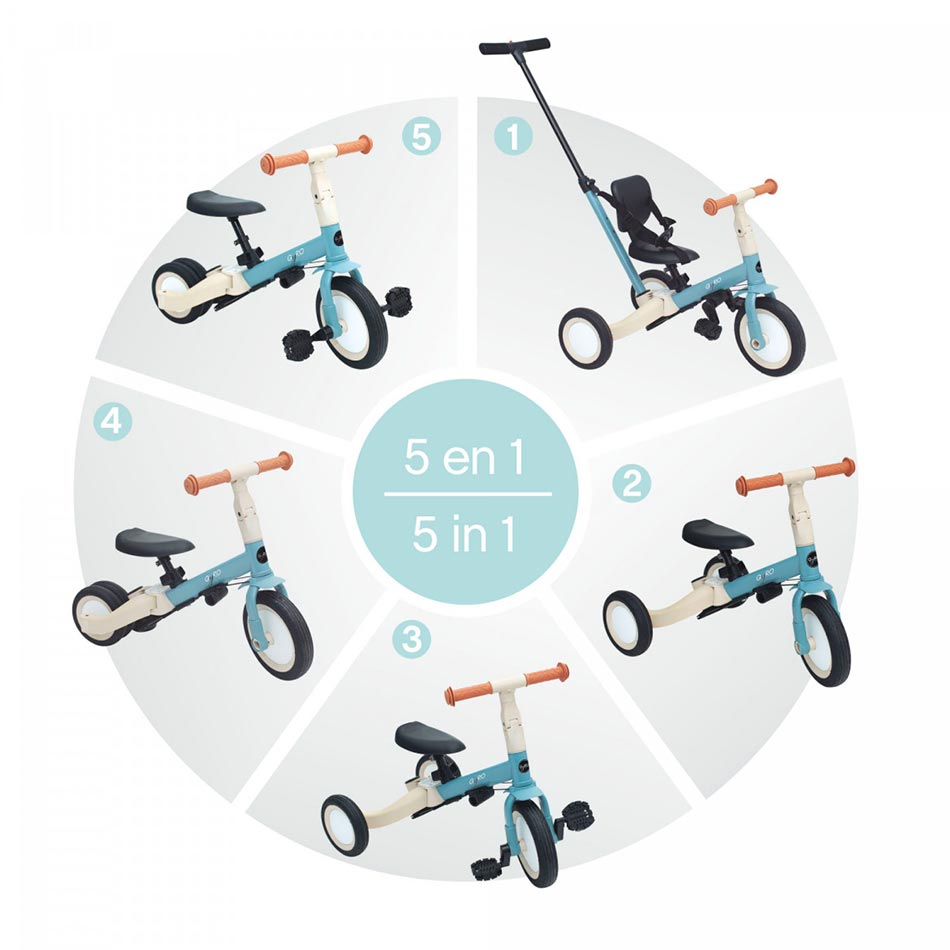 Se puede utilizar de 5 formas diferentes según la edad y las habilidades del niño adaptandose a su crecimiento al tiempo que le facilita a aprender a montar en bicicleta.