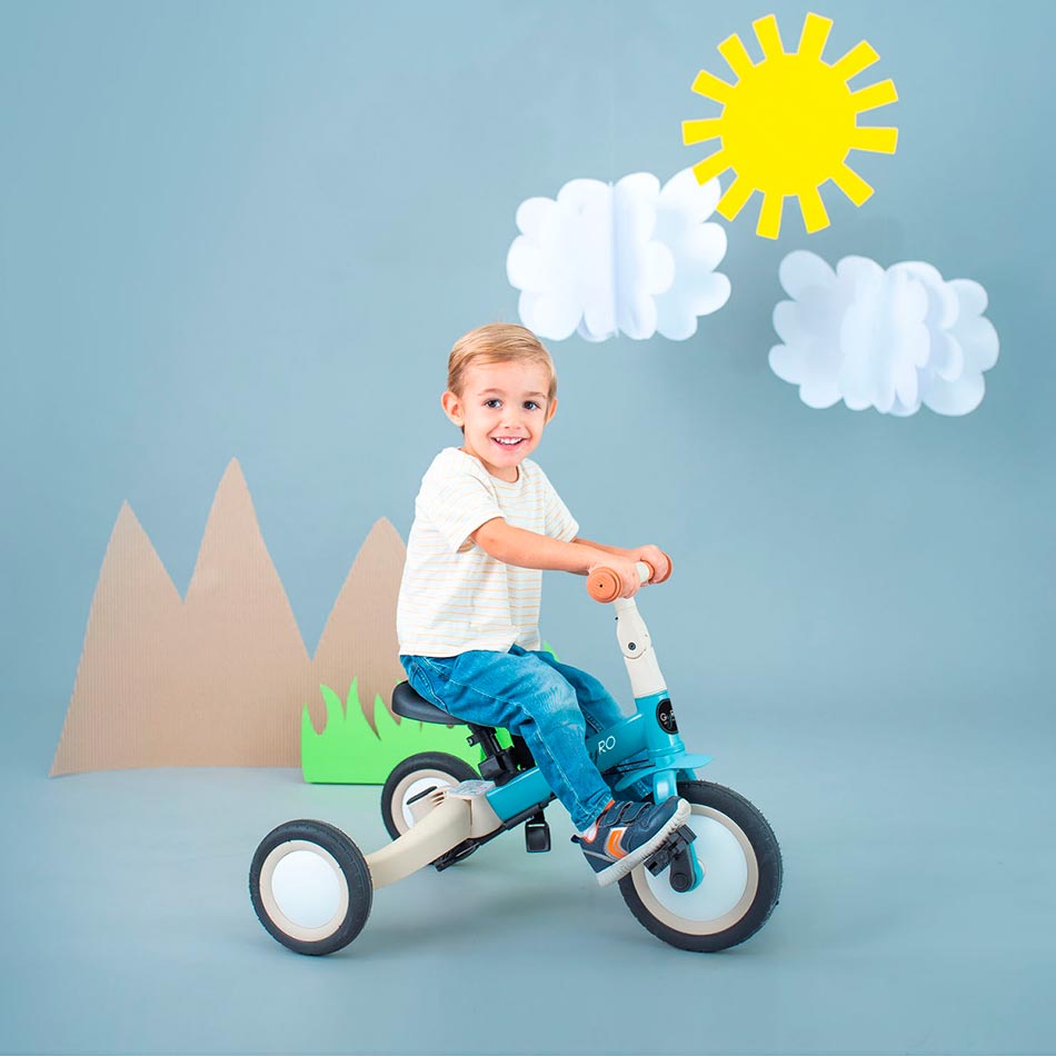 Provisto de un sencillo sistema que permite transformar la bicicleta sin herramientas y ajustarla a la edad del niño.